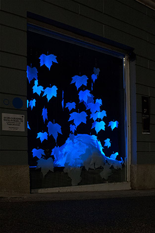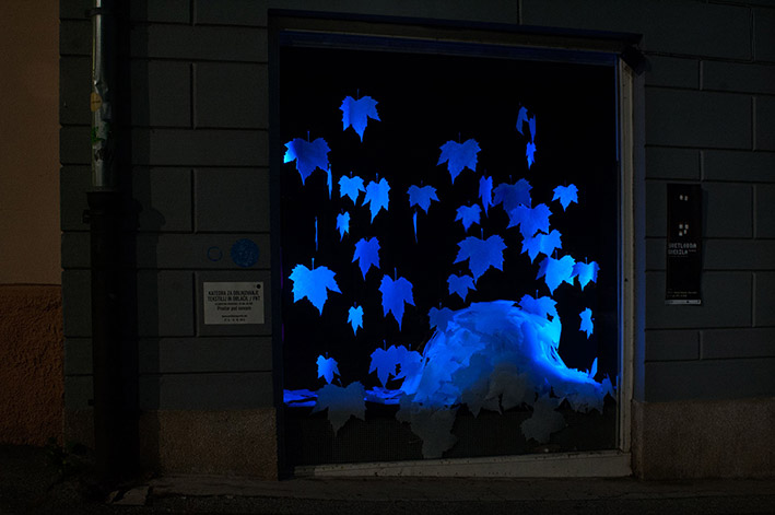 Two years ago, in the course of their studies under Prof. Elena Fajt and Prof. Marija Jenko, the creators of this installation Klementina Kranvogel and Ana Jelinič - the latter from Novo Mesto - have changed the private for the public. In the framework of the project, they closed the leaves from the nearby park into a building. Is it that the textile leaves coated with a reflective paint warn that winter is coming after every summer?